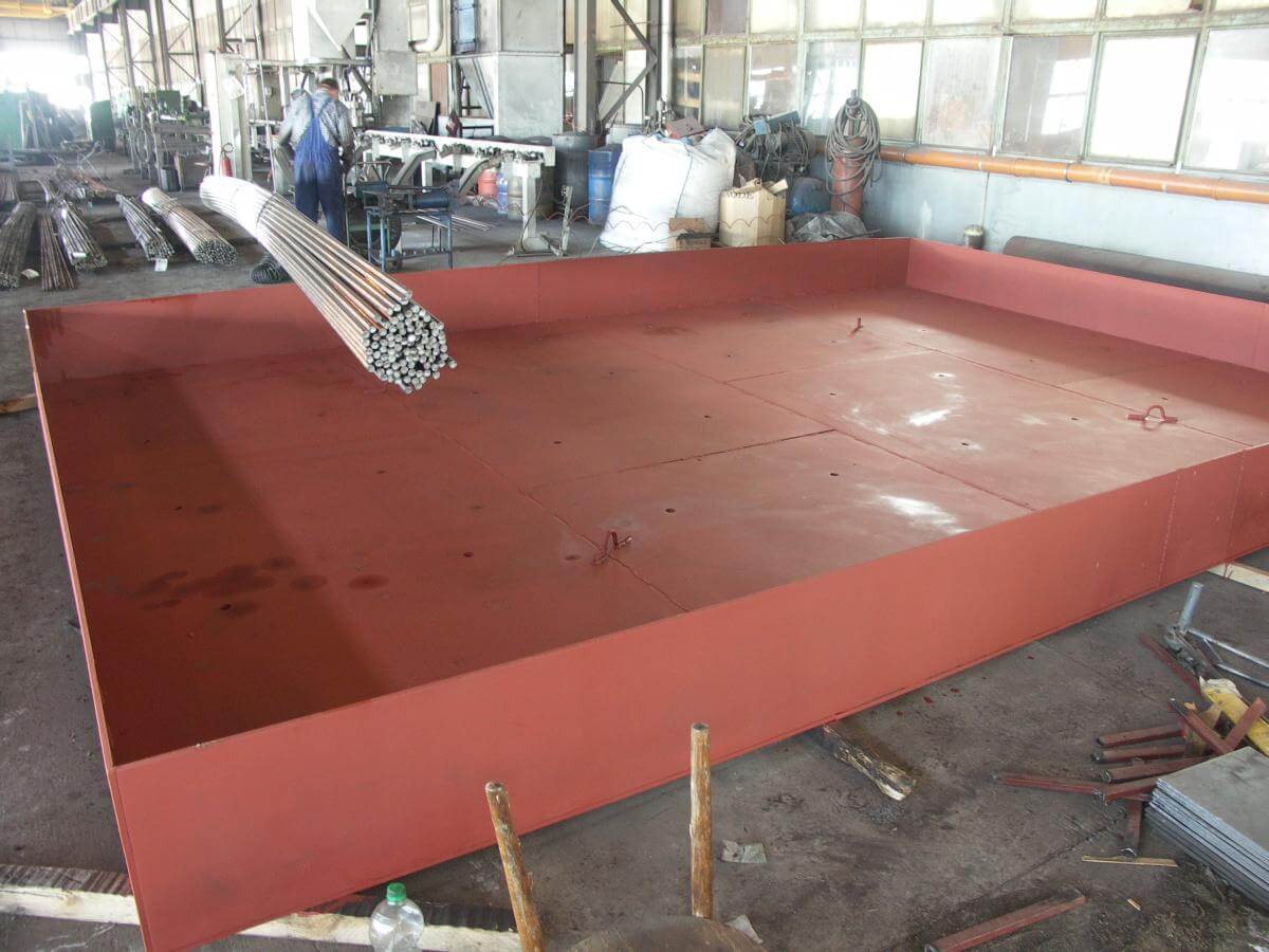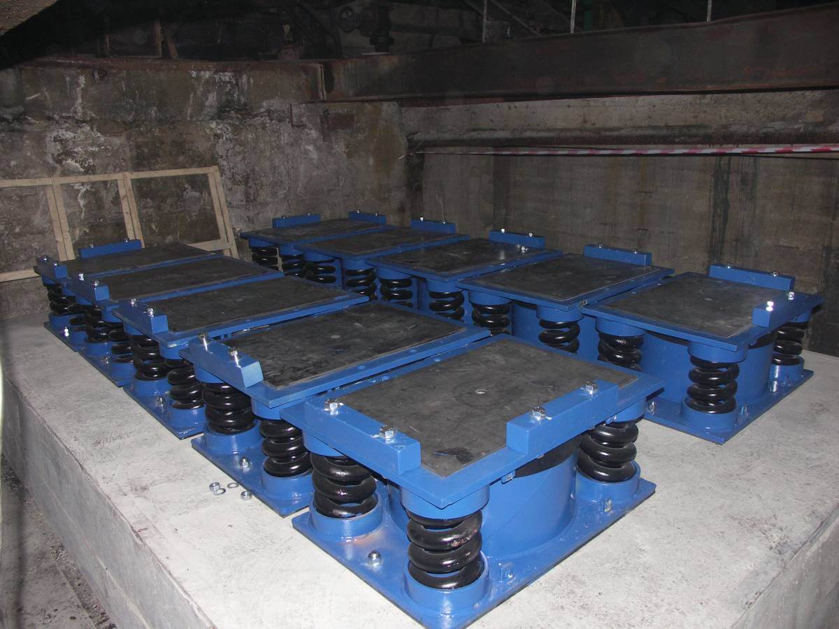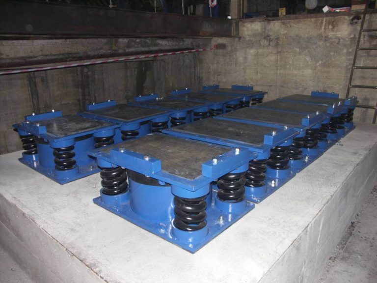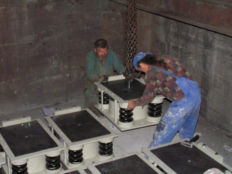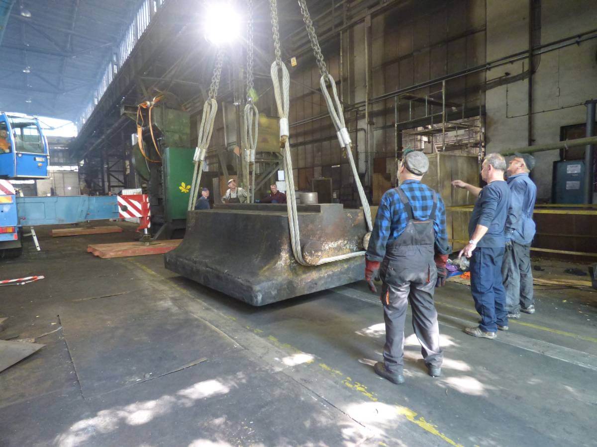 Przebudowa fundamentu młota matrycowego MPM 10000B. Zakres prac obejmował wyburzenie pierwotnego zniszczonego bloku podkowadłowego, dostosowanie wnętrza skrzyni do nowego rozwiązania, wykonania nowej płyty wraz z cokołem pod wibroizolację, a dalej produkcję, dostarczenie oraz zamontowanie dziesięciu wibroizolatorów sprężynowo-lepkościowych.