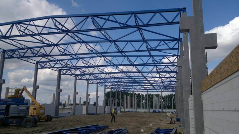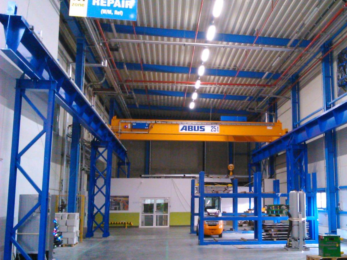 Projekt budowlany oraz warsztatowy belek podsuwnicowych na trzy suwnice jeżdżące w dwóch poziomach. Jedna suwnica 10t o rozpiętości ponad 35m, jeżdżąca po 35,5m torowisku, zlokalizowana niżej i obsługująca część hali oraz dwie suwnice pod dachem, rozpięte na ponad 36m, potrafiące podnieść ładunek 10t i 40t i przenosić go na długości 90m.